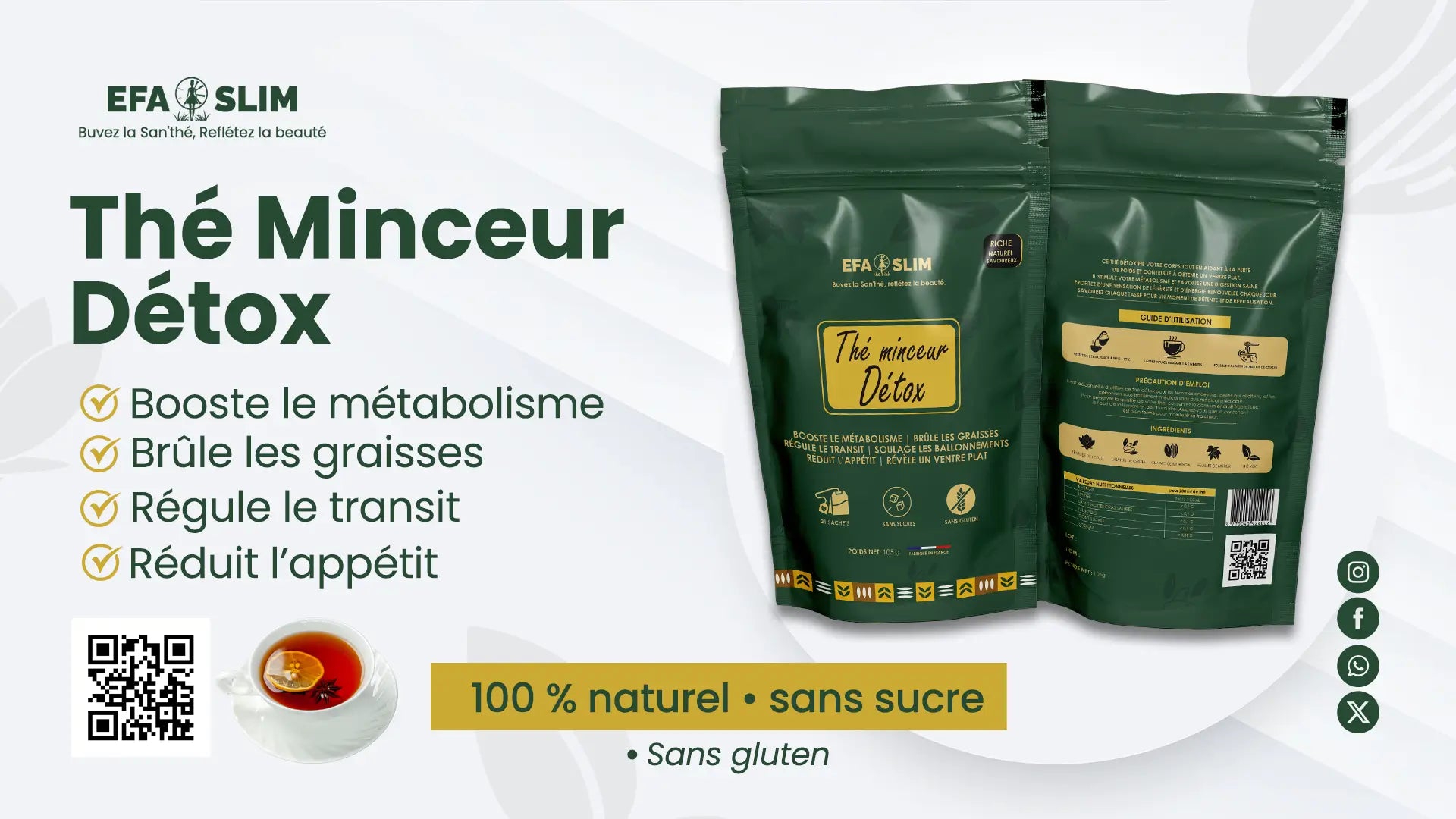 Chez EFA SLIM, nous avons conçu un thé détox unique qui agit en synergie pour transformer votre quotidien. Grâce à une formulation 100 % naturelle, notre infusion booste naturellement votre métabolisme, aidant votre corps à brûler plus efficacement les graisses.
